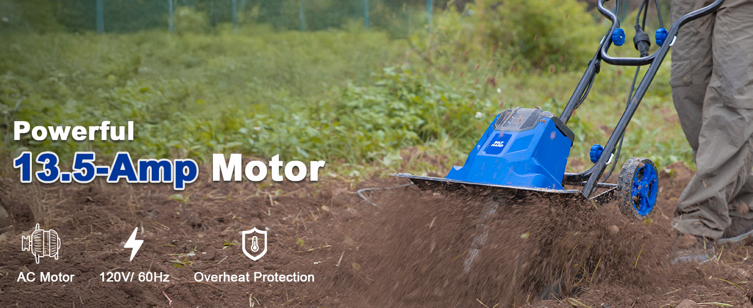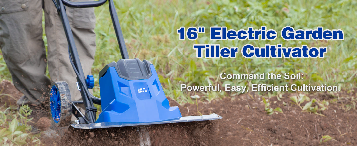 Powerful Performance for Effortless Gardening: Tackle tough soil with ease. The BILT HARD Electric Garden Tiller is powered by a high-performance 13.5-amp AC motor that delivers speeds up to 19,000 RPM, cultivating soil up to 16 inches wide and 8 inches deep—perfect for prepping flower beds, gardens, and lawns.