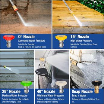 - 5 Quick Connect Nozzle - 0°(red), 15°(orange), 25°(green), 40°(white), soap(black) from high-impact water beams to soft scattering. Suitable for cleaning metal, walls, pavement, wood decks, glass and cars.