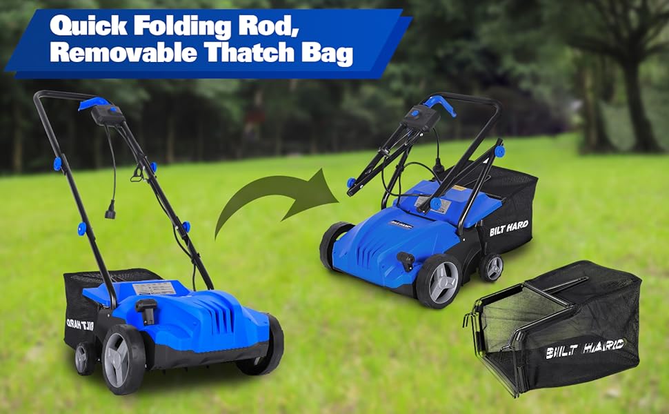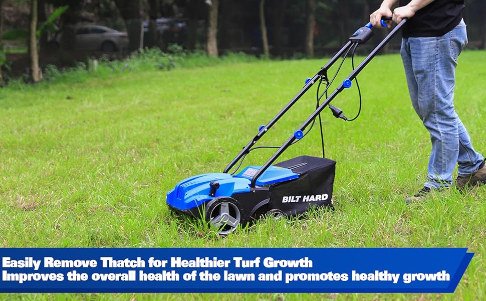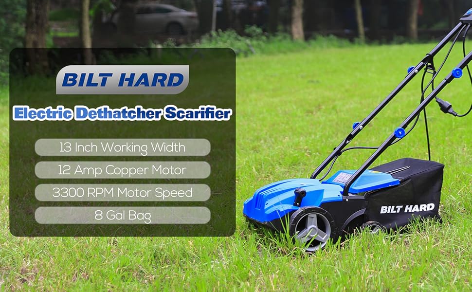 BILT HARD 12 Amp Electric Dethatcher & Scarifier: 13" Width, 8-Gallon Bag, 2-in-1 Walk-Behind Lawn Tool