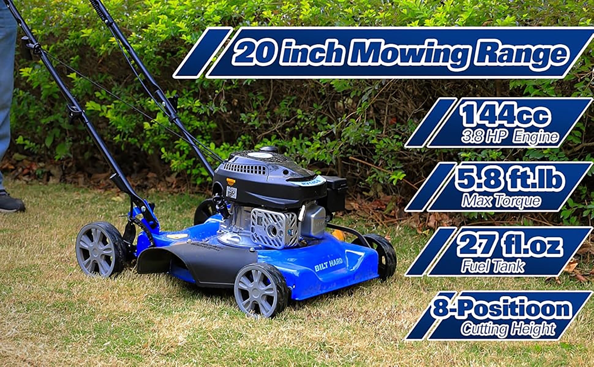 Achieve a lush, healthy lawn with the BILT HARD 20" Gas Lawn Mower. Powered by a robust 144cc engine, this mower delivers exceptional performance for a beautifully manicured yard. The 8-position height adjustment ensures you can achieve the perfect cut every time, while the ergonomic grip and smooth-rolling wheels make mowing comfortable and effortless.