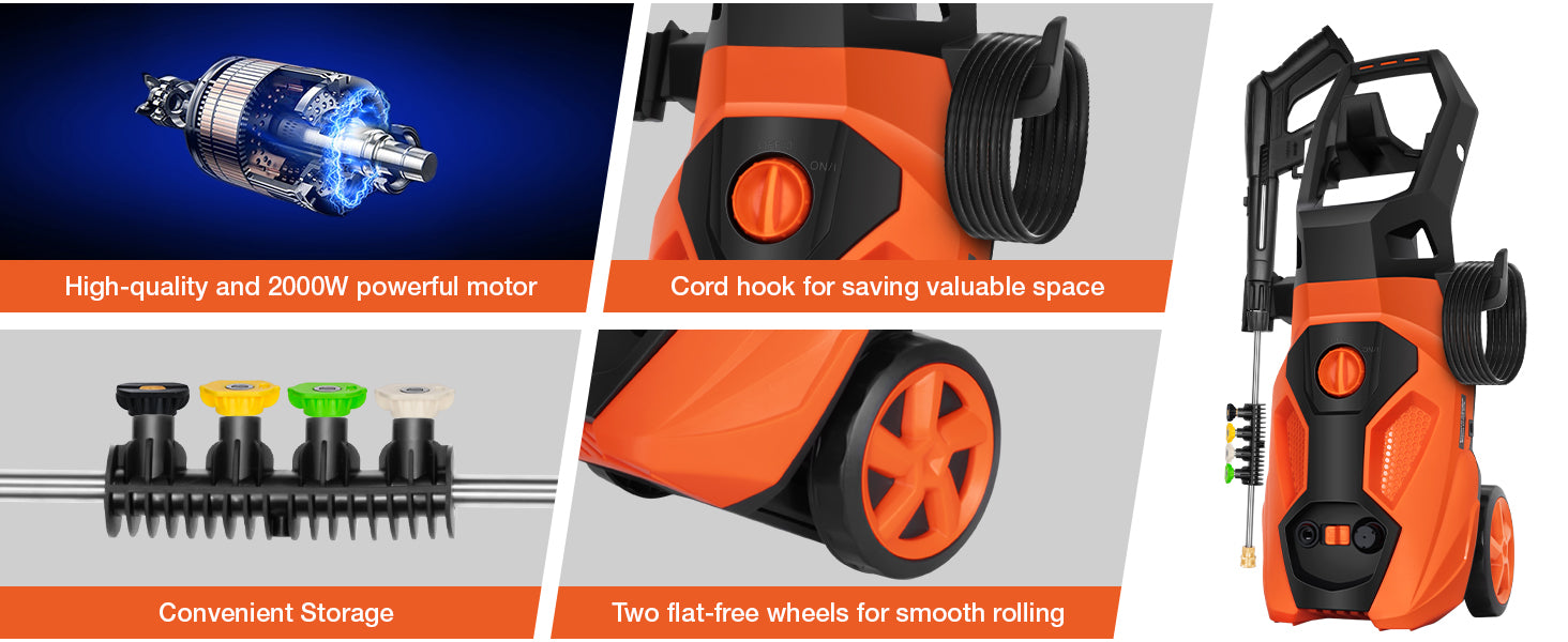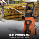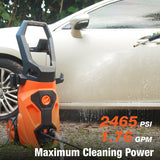 Powerful Cleaning: This high-power pressure washer features a 2000W motor, delivering 2465 PSI and 1.76 GPM for efficient cleaning of walls, pavements, wood decks, patios, sidewalks, RVs, homes, glass, and cars.