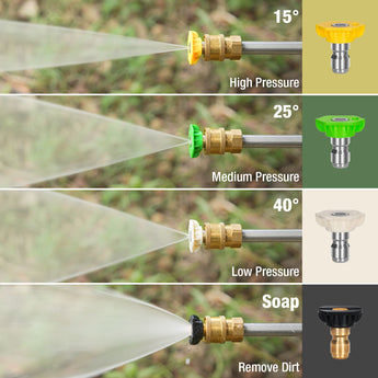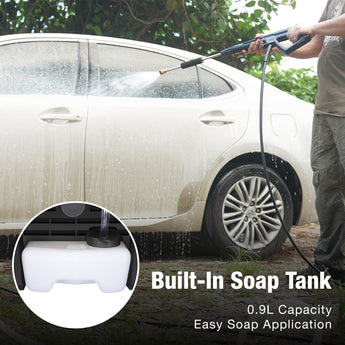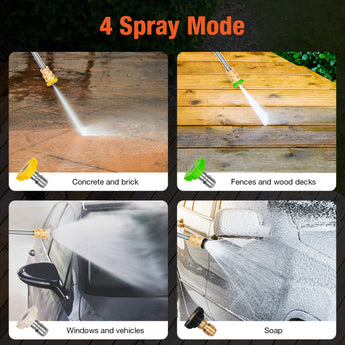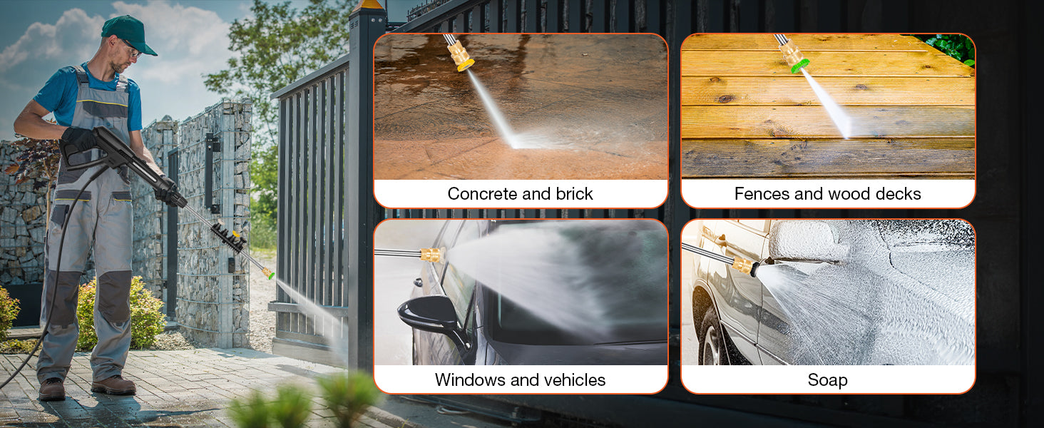 Versatile Use: The power washer includes a quick-connect stainless steel wand and five spray nozzles (15°, 25°, 40°, soap, and turbo) to cater to different cleaning tasks. The built-in detergent tank ensures easy and effective soap application.