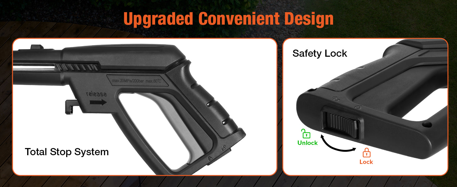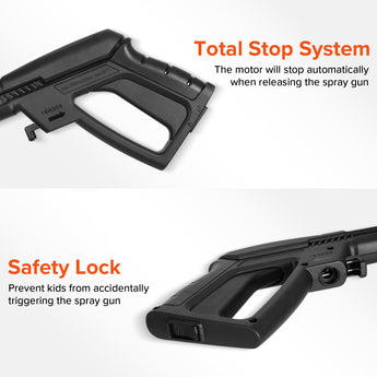Enhanced Safety: The TSS (Total Stop System) automatically shuts off the motor when the trigger is released, conserving energy and extending the life of the pump and motor. A safety lock button prevents accidental spraying, and the GFCI plug ensures safe outdoor use.