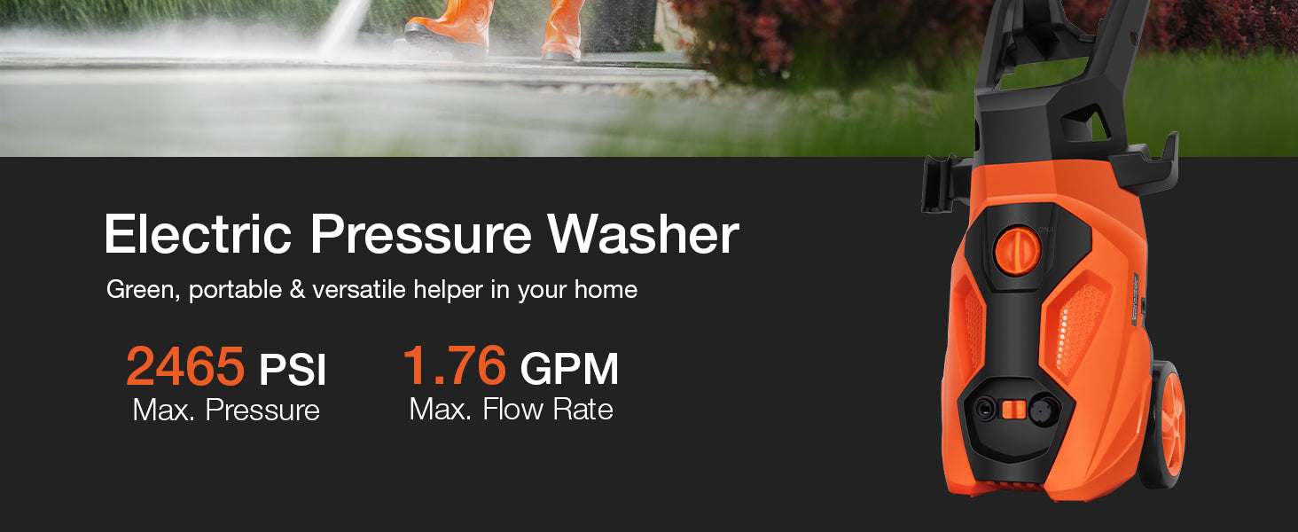 Electric Pressure Washer, 2465 PSI 1.76 GPM Power Washer, 5-Nozzle Set, Built-in Soap Tank, 20 Ft Hose, 35 Ft Power Cord, Stainless Steel Wand, for Cars, Driveway, Home, Patios (Orange)