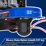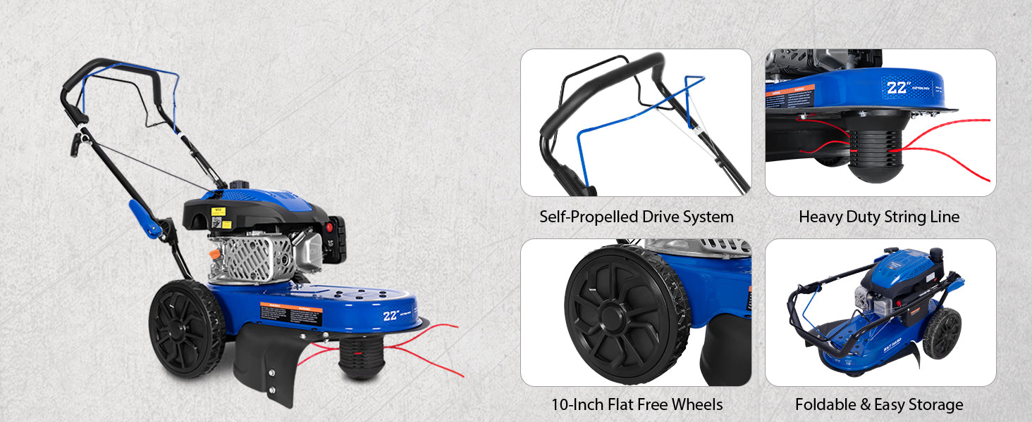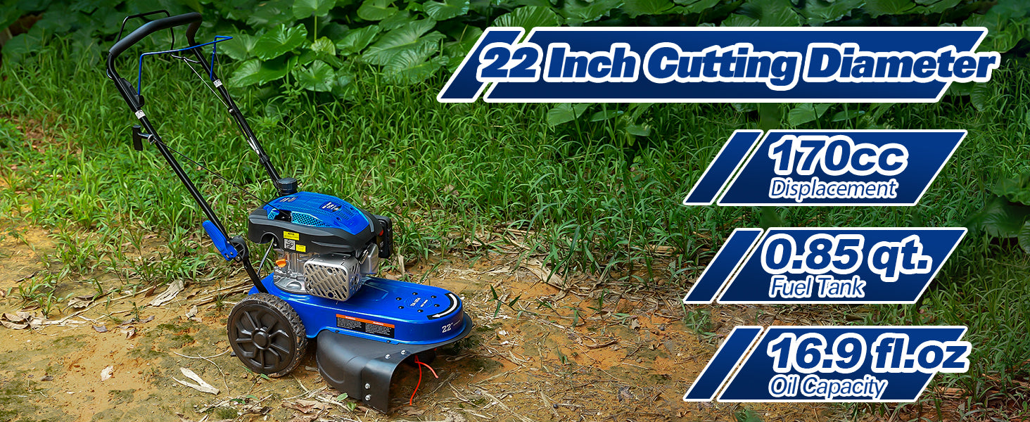 Durable Steel Deck & Wide Cutting Path — Built to last, the heavy-duty one-piece steel deck provides stability and reduces vibration. With a 22-inch cutting diameter and tough nylon line, you can clear a wide path in a single pass, saving time and effort.