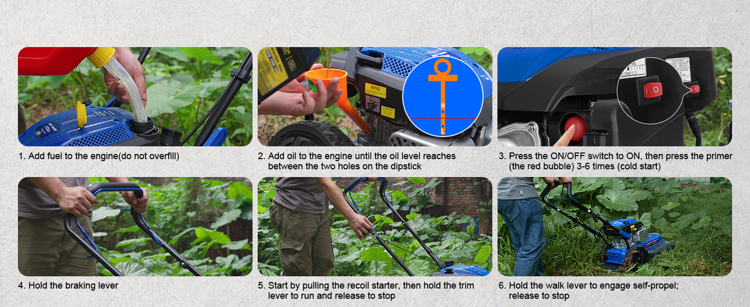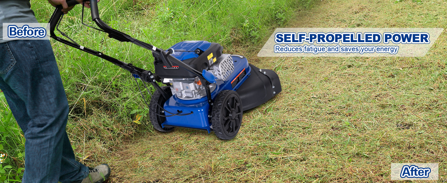 Self-Propelled for Effortless Mowing — Let the mower do the work! The self-propelled drive system moves at a steady speed of 3.06 km/h (approx. 1.9 mph), making it easy to glide over lawns, fields, or uneven terrain—just guide it where you need it to go.
