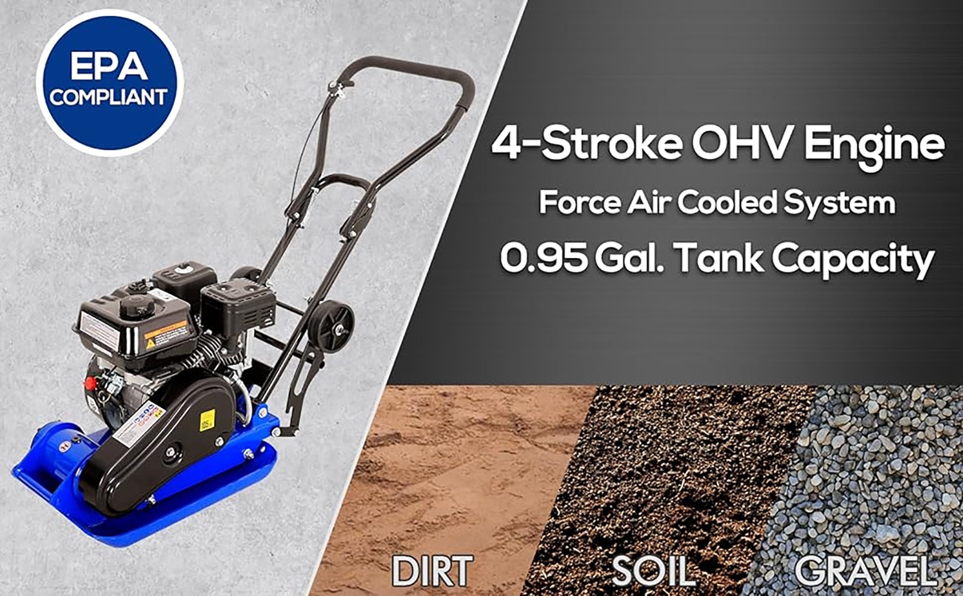 Safety & Maintenance Made Simple — Your safety comes first. Always read the user manual before use, wear proper eye and hand protection, and check all nuts regularly. The compactor runs on unleaded 86+ octane gasoline (0.95 gal tank) and SAE 10W-30 engine oil (0.16 gal capacity). Engine oil not included.
