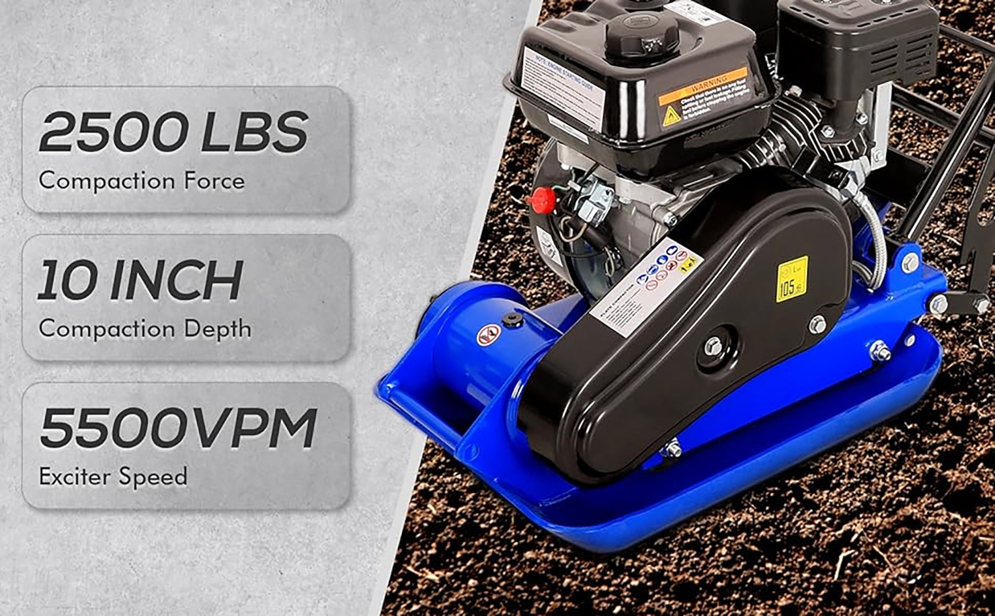 Built for Power. Designed for Results. — Take control of your toughest compaction jobs with the BILT HARD 2500 lbs Plate Compactor, powered by a reliable 196cc / 6.5HP Loncin® gas engine. With a 10-inch compaction depth, 2,500 lbs of force, and 5,500 vibrations per minute, this machine is ideal for compacting soil, gravel, sand, asphalt, and more—making it perfect for driveways, patios, landscaping, and foundation work.