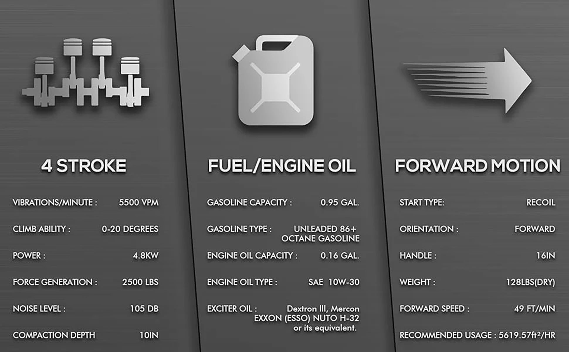 | Maximum Power | 4.8 Kilowatts | Compaction Force | 2500 lbs |