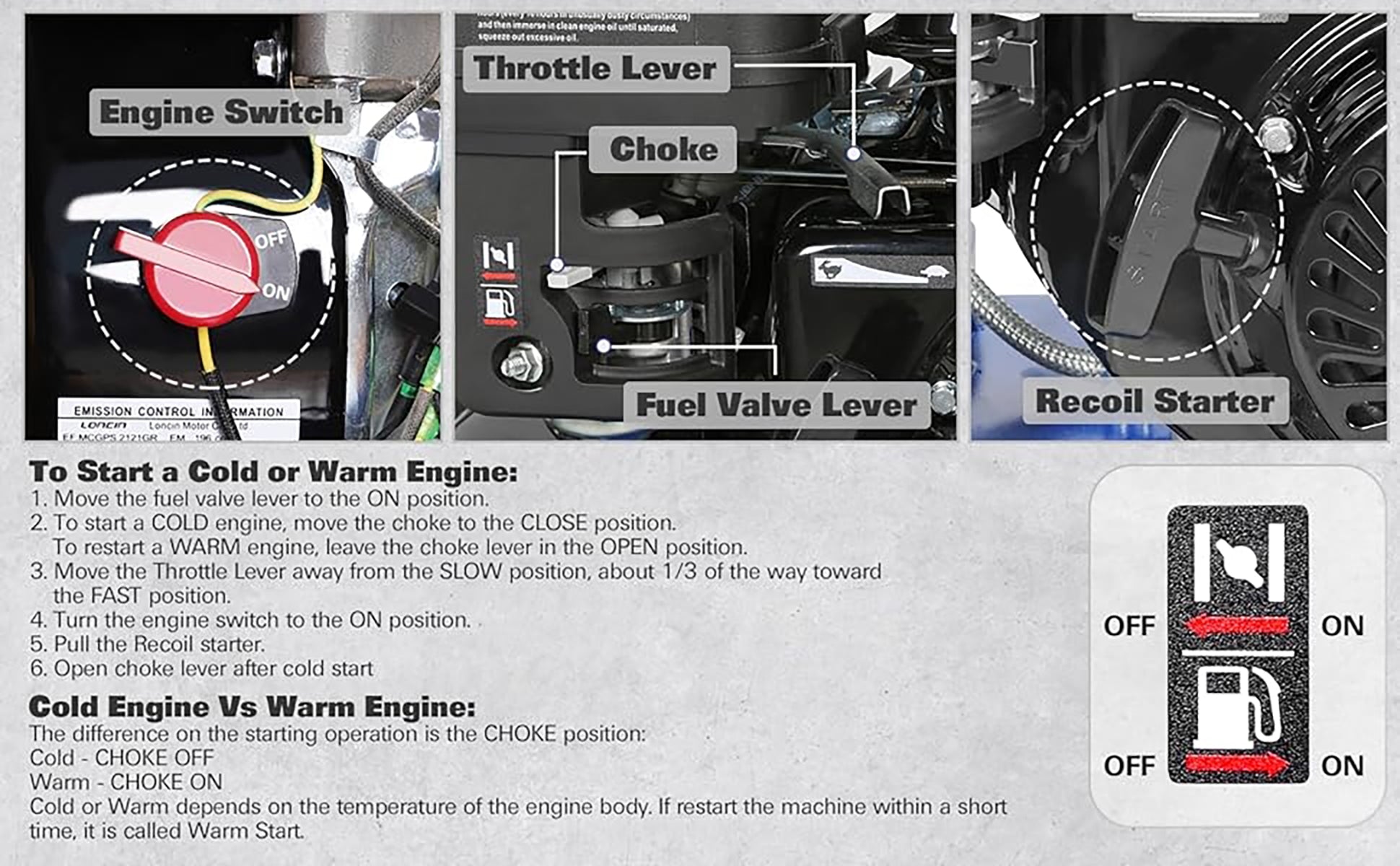 Please ensure you add enough oil before starting the engine. The engine’s protection system will prevent it from starting if the oil level is too low.