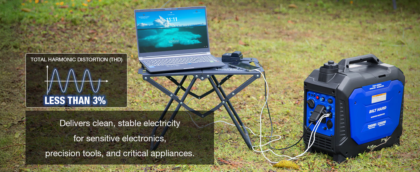 Clean, Reliable Power (<3% THD): This inverter generator produces pure sine wave electricity with less than 3% Total Harmonic Distortion (THD)—ideal for safely powering sensitive electronics like laptops, phones, and TVs. Includes two 120V 15A AC outlets (NEMA 5-20) and one 12V 8A DC output, all circuit-breaker protected for added safety.