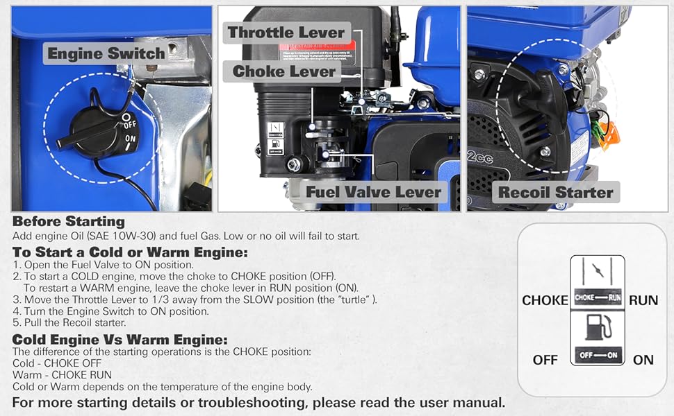 For cold starts, partially close air intake ports to enrich the fuel mixture.