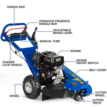 • Cuts 23.6" above ground and grinds 9.3" below ground level to completely remove stumps and prevent regrowth. Transform unusable yard space into prime real estate for landscaping, patios, or easier lawn maintenance. Large tubeless tires roll smoothly over rough terrain while dual V-belt drive ensures reliable power transfer. Compact design reduces operator fatigue and makes maneuvering around obstacles effortless.