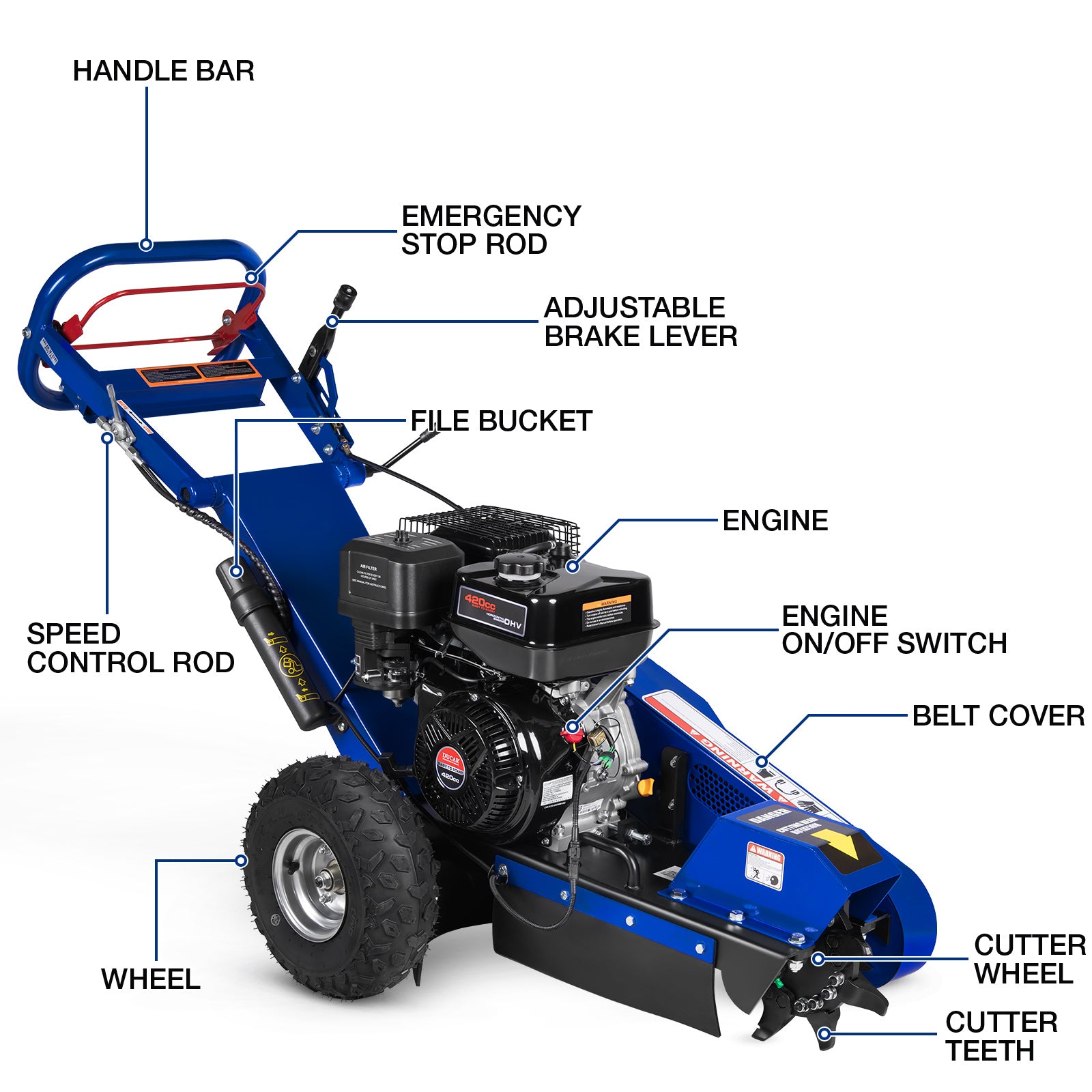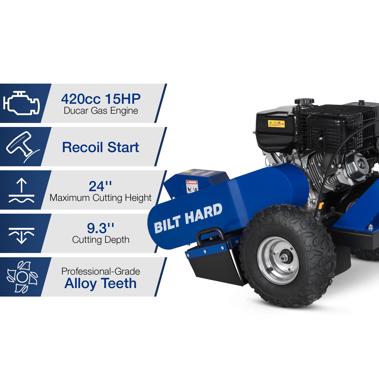 Powered by a robust 420cc 4-stroke engine delivering 15HP at 3600 RPM, this stump grinder is built for serious performance. Equipped with 9 hardened alloy teeth, it cuts aggressively through hardwood and stubborn root systems with confidence and control.