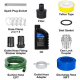 Complete Kit Included – Comes with everything you need to get started: a 50 ft discharge hose, 12 ft suction hose, cam lock coupler, intake filter, oil funnel, spark plug socket, clamps, fittings, and adapters. Tip: Use thread sealing tape when connecting hoses to prevent leaks.