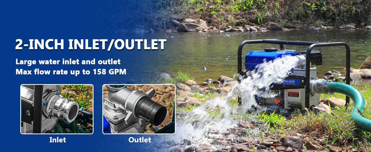 Engineered for high efficiency and performance, this water pump delivers a maximum flow rate of 158 gallons per minute—ideal for removing groundwater, irrigating large areas, and draining pools with speed and ease. Featuring a 2-inch inlet and outlet, it provides an impressive total head lift of up to 91 feet and a suction head lift of 26 feet, making it a reliable choice for a wide range of demanding applications.