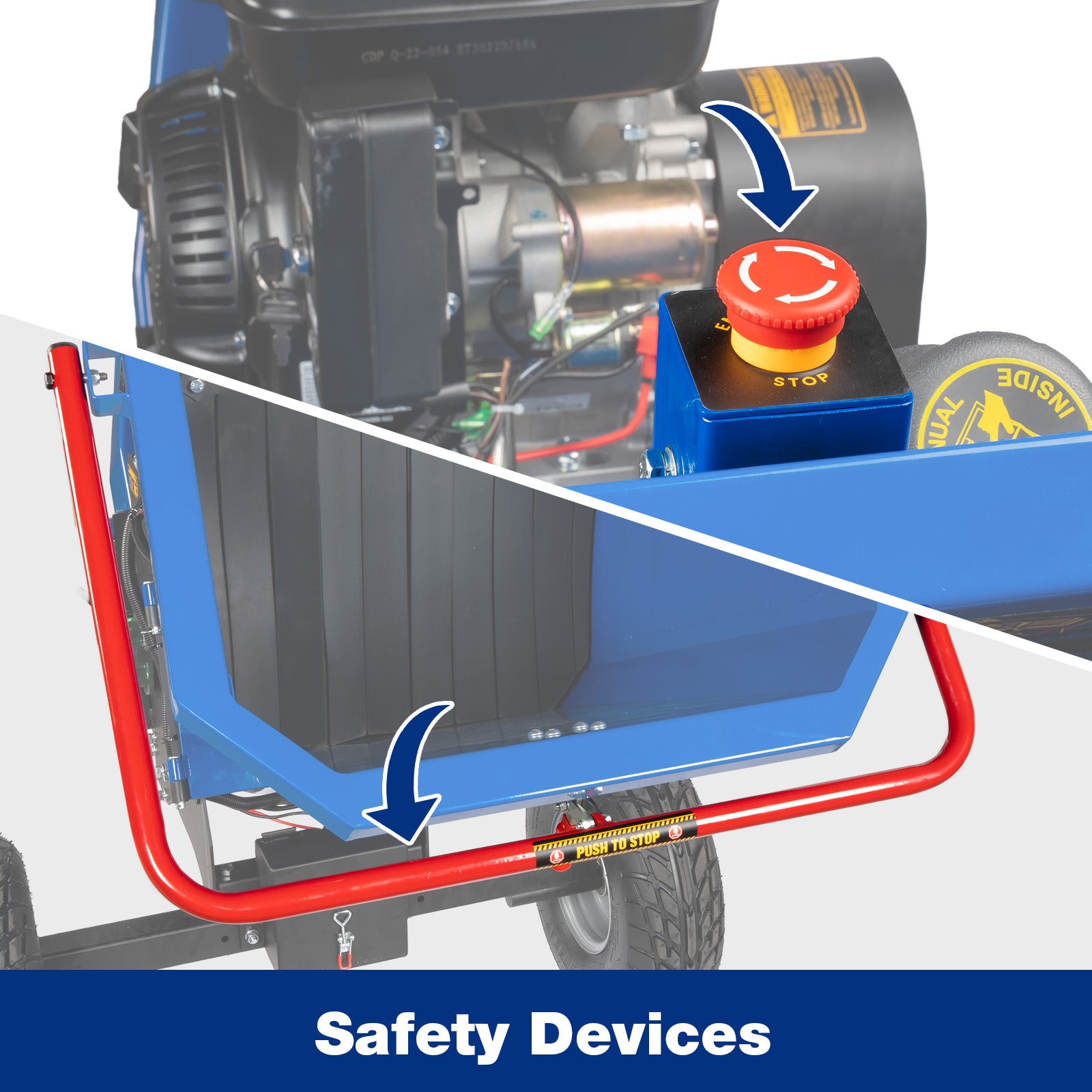 The feeding chute features dual emergency shut-off controls for enhanced safety — a convenient stop button on top and a press bar at the bottom. Either control lets you immediately shut down the machine in an emergency, giving you peace of mind while you work.