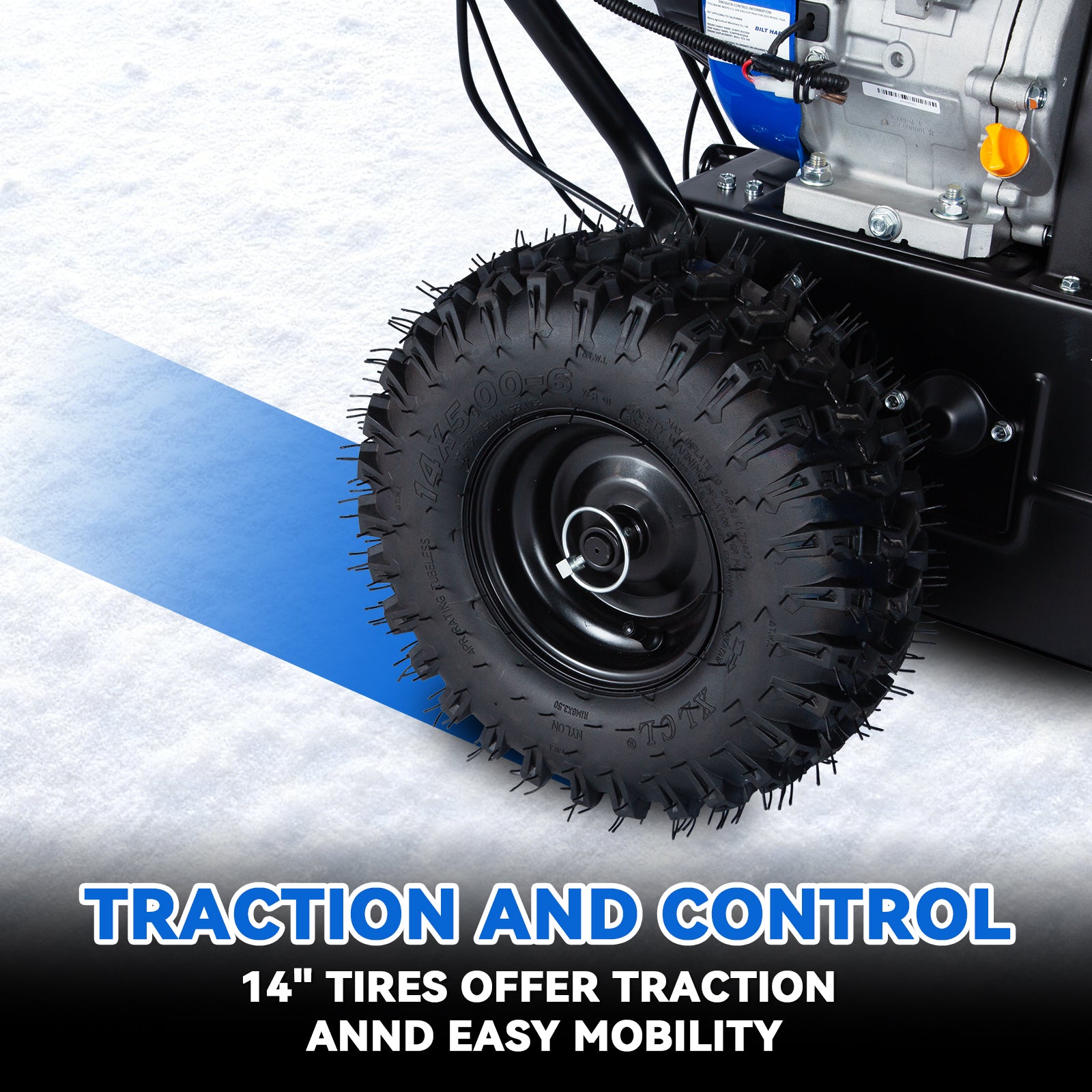 Large pneumatic tires provide exceptional traction on gravel, concrete, and other surfaces, offering superior stability and control. Adjustable skid shoes protect delicate surfaces from scuffs and scratches, making this blower suitable for all terrains.