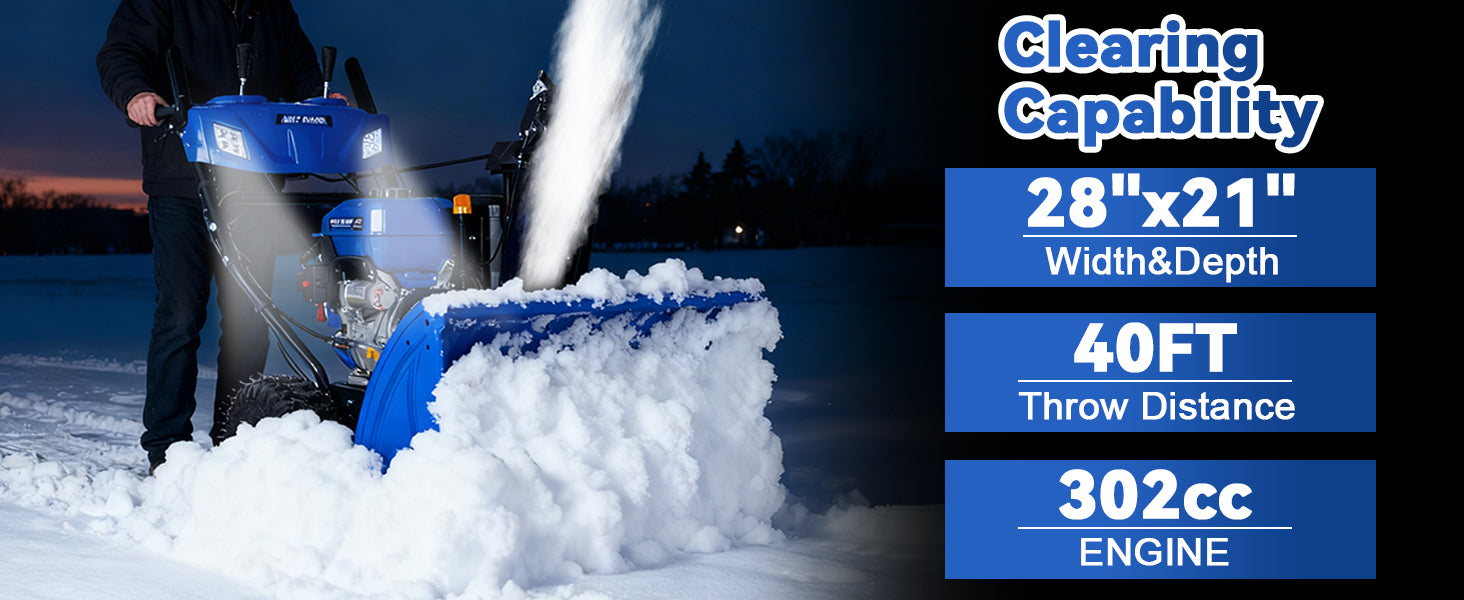 Efficient Snow RemovalPowered by a robust 302cc 4-cycle engine, this snow blower delivers exceptional power and reliable performance to tackle the heaviest snowfalls. With its full 28-inch clearing width, it effortlessly clears your driveway or walkway and throws snow up to an impressive distance, ensuring quick and thorough snow removal.