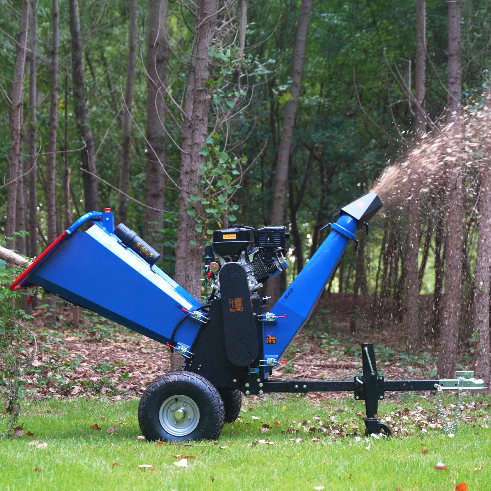 • Maintenance is quick and simple—both the feeding chute and discharge chute open easily for servicing, blade access, or cleaning. The 56-inch tall discharge chute rotates a full 360 degrees, allowing you to direct chips exactly where you want them, whether into a trailer, pile, or onto the ground.