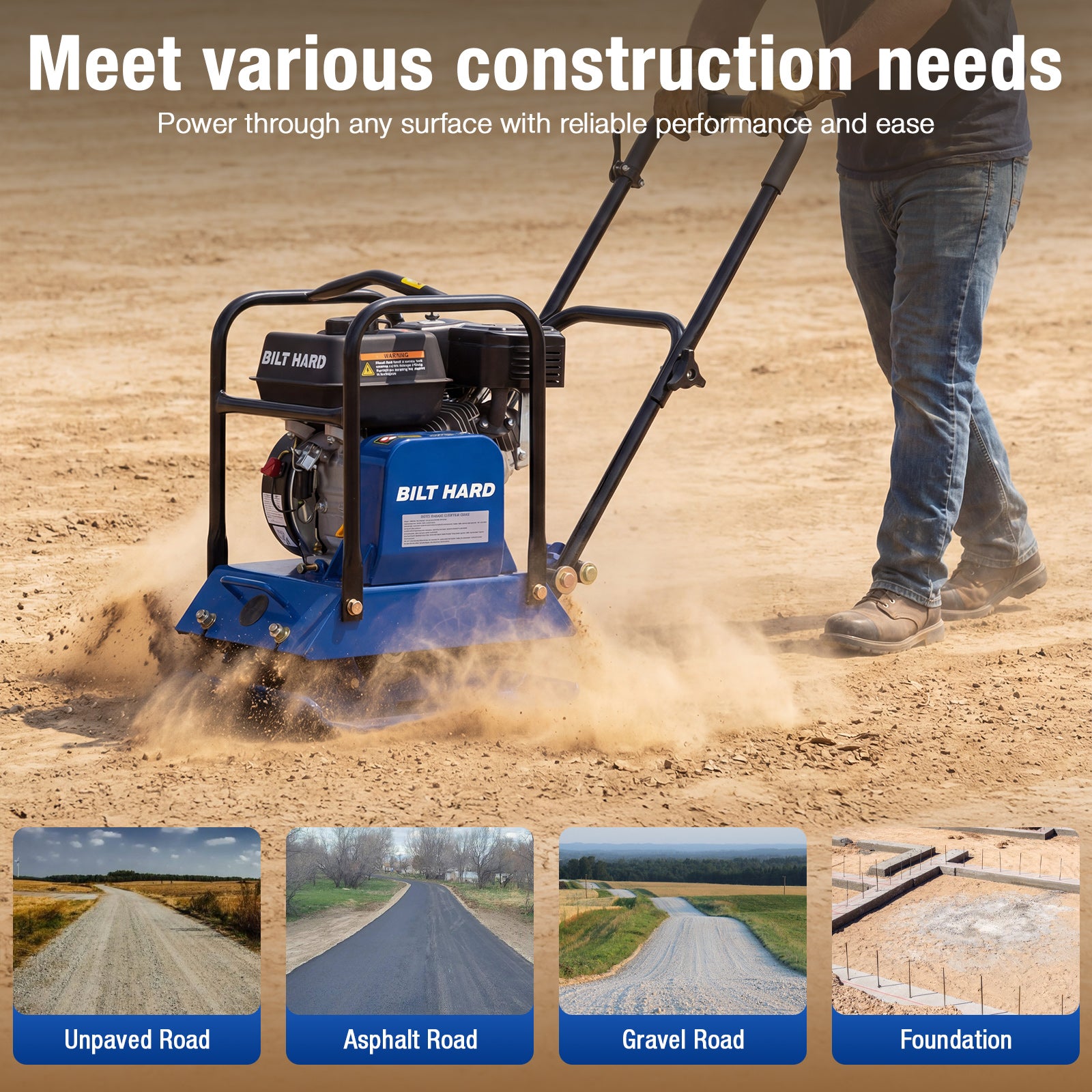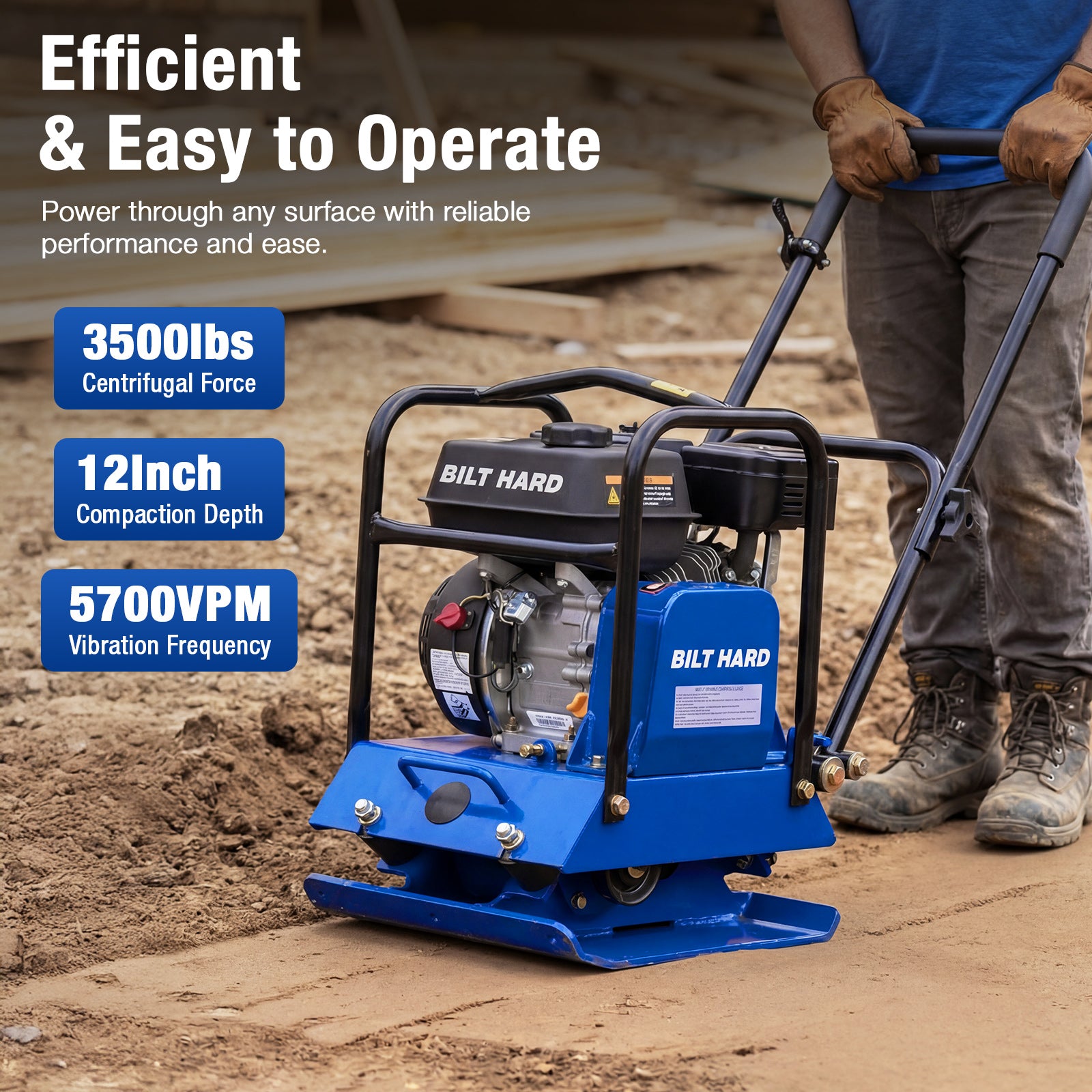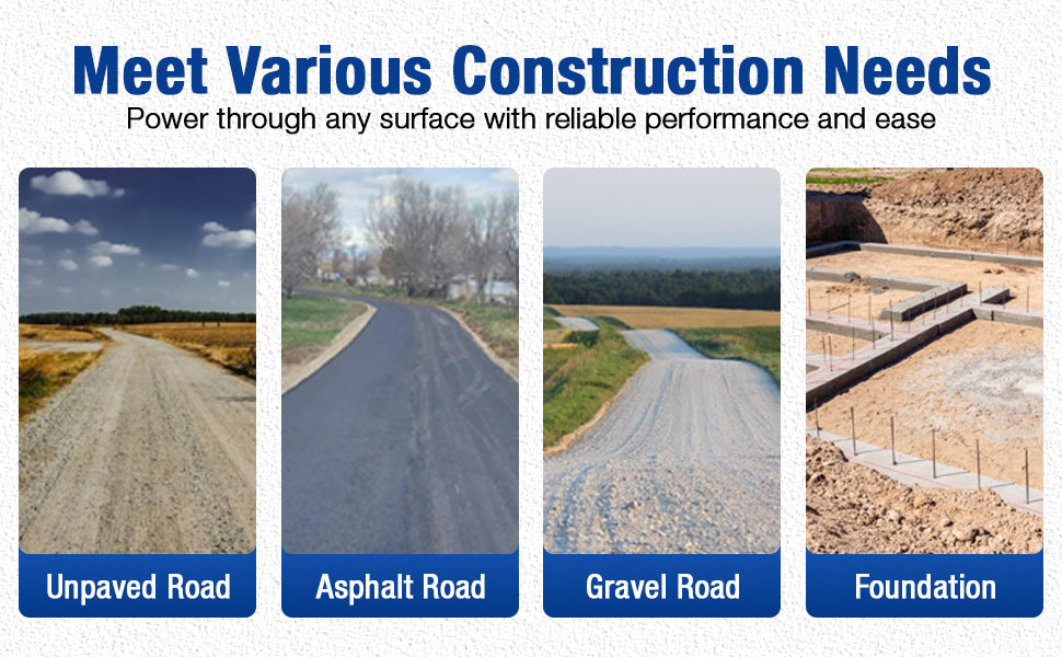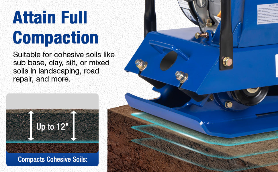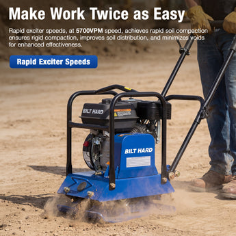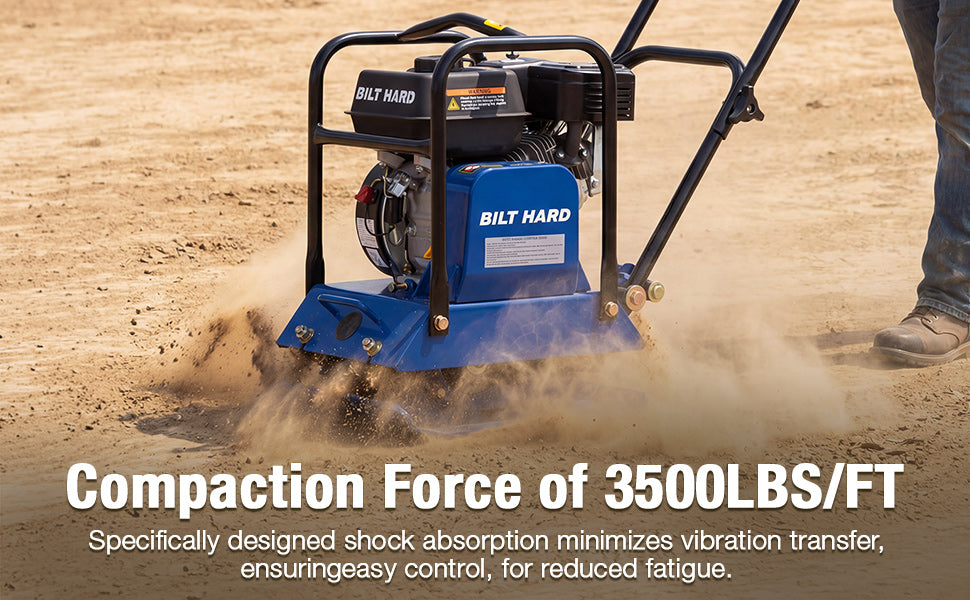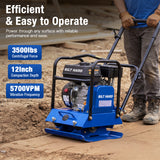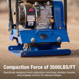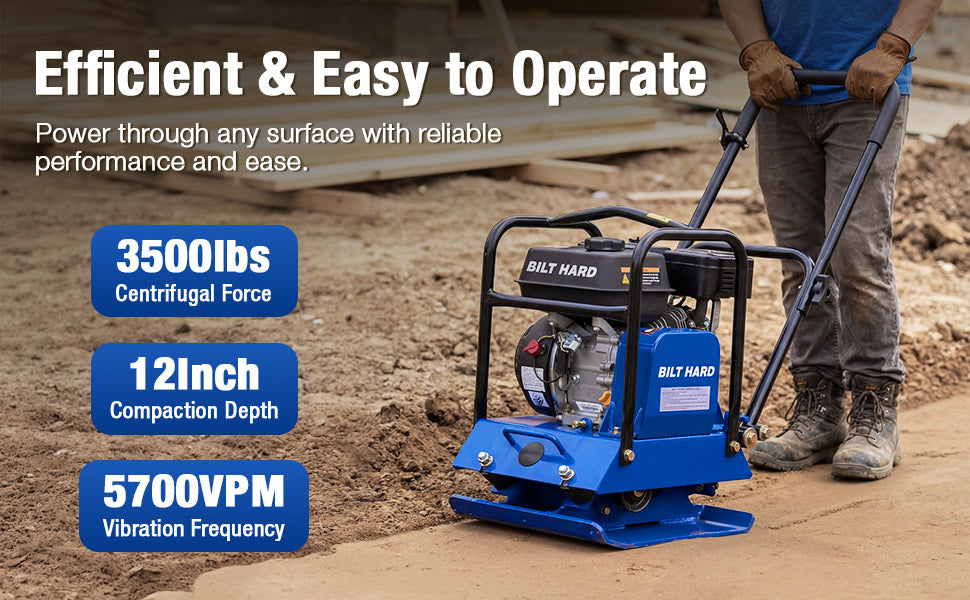 Built to handle tough ground preparation jobs, this vibratory plate compactor delivers 3,500 lbs of compaction force and reaches up to 12 inches deep. With a 5,700 VPM vibration frequency and a travel speed of 984 in/min, it provides fast, even compaction for soil, gravel, sand, and asphalt — ideal for patios, sidewalks, driveways, landscaping, and foundation prep.