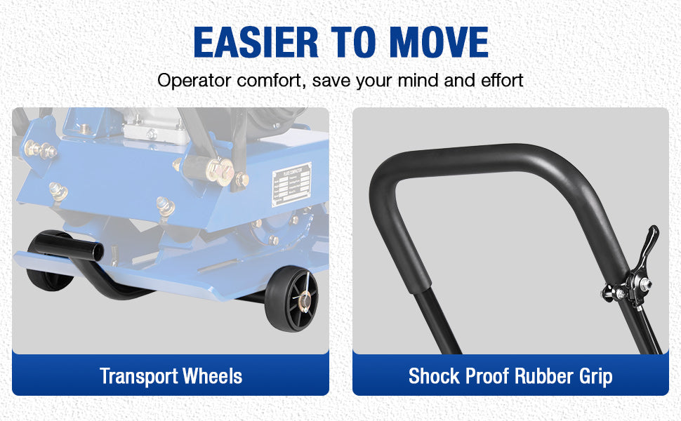 Heavy-duty, wear-resistant transport wheels allow smooth movement across job sites. The shock-absorbing rubber handle reduces operator fatigue and improves control during use and relocation.