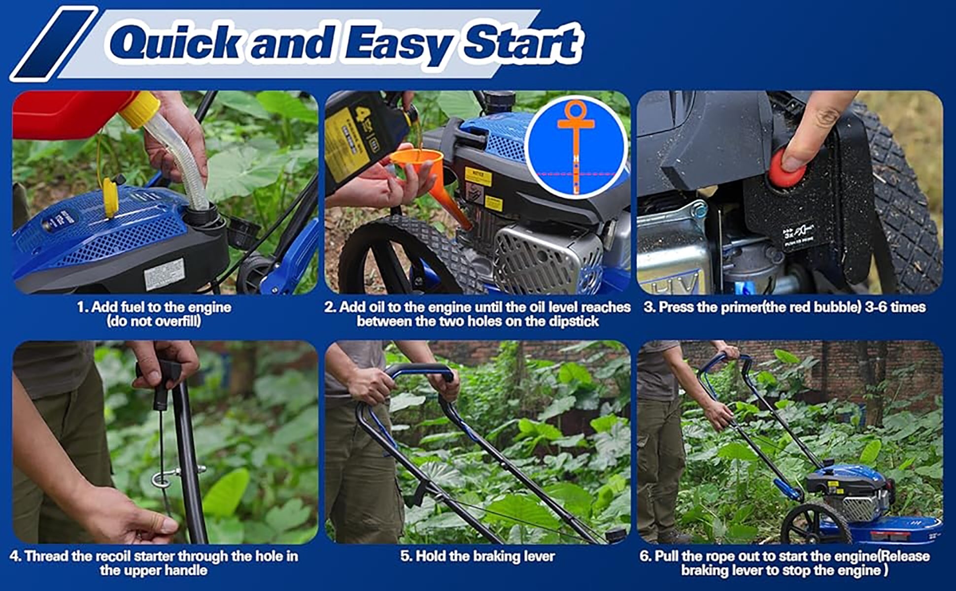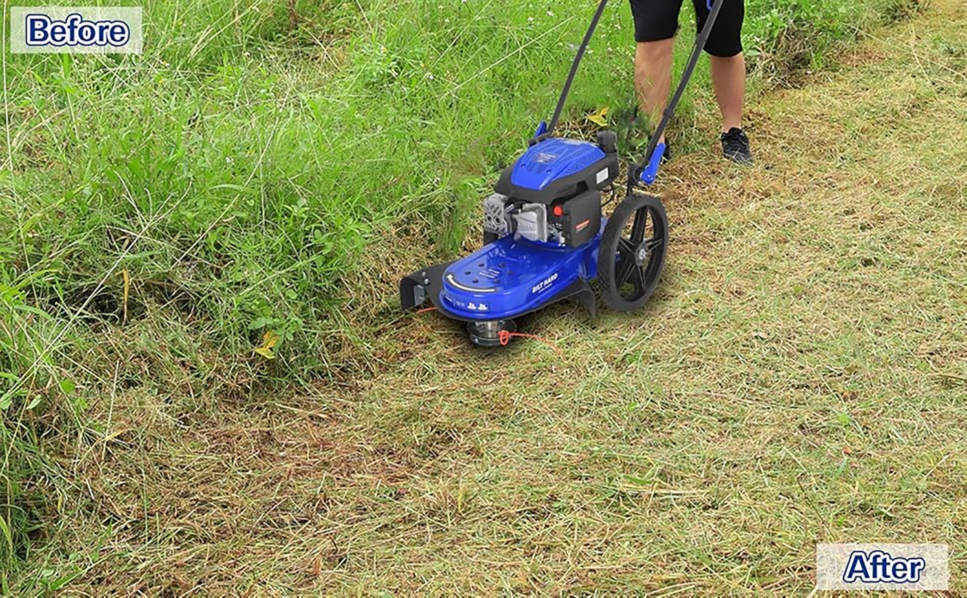 Tackle hard-to-reach areas with ease using this powerful wheeled trimmer. Featuring a robust 170cc OHV engine and a reliable manual recoil start, this push trimmer effortlessly clears a 22-inch wide path through thick grass and tough weeds. Its large 14-inch wheels provide superior maneuverability over uneven terrain, while the durable one-piece steel deck enhances strength and stability, reducing vibration for smoother operation. Designed for comfort and convenience, the foldable ergonomic handle ensures a secure grip and allows for compact storage when not in use.
